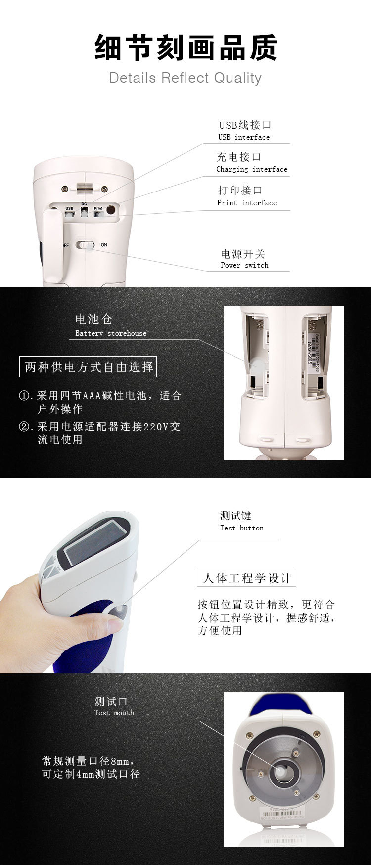 儀器內(nèi)置日本的傳感器,美G的信息處理芯片;保證了光信號的準(zhǔn)確傳輸和電信號的穩(wěn)定,為儀器的精度和重復(fù)性保駕護(hù)航,顯示精度0.01,重復(fù)精度△E標(biāo)準(zhǔn)偏差值0.08。