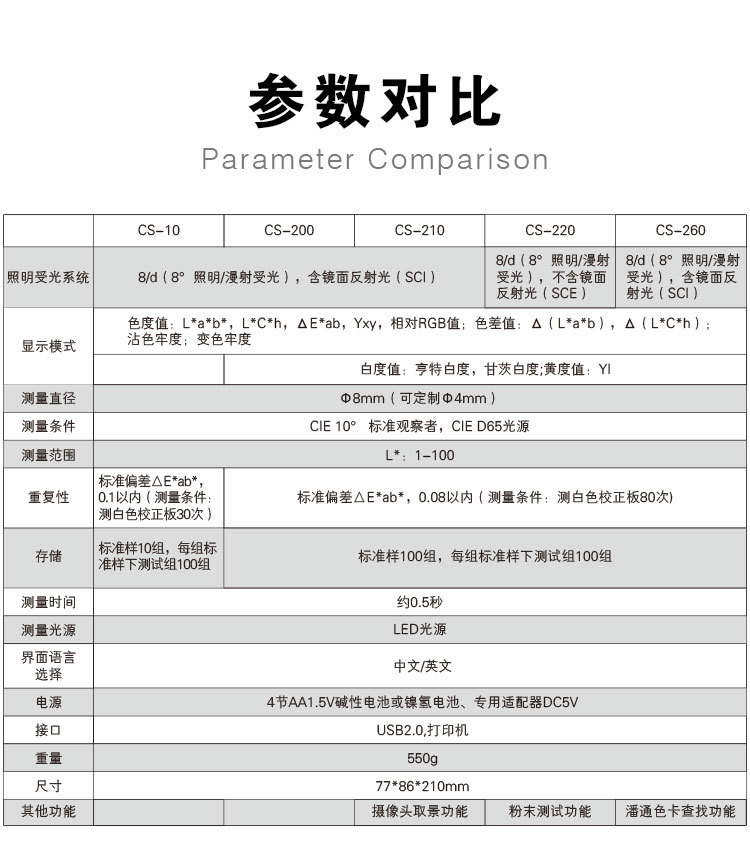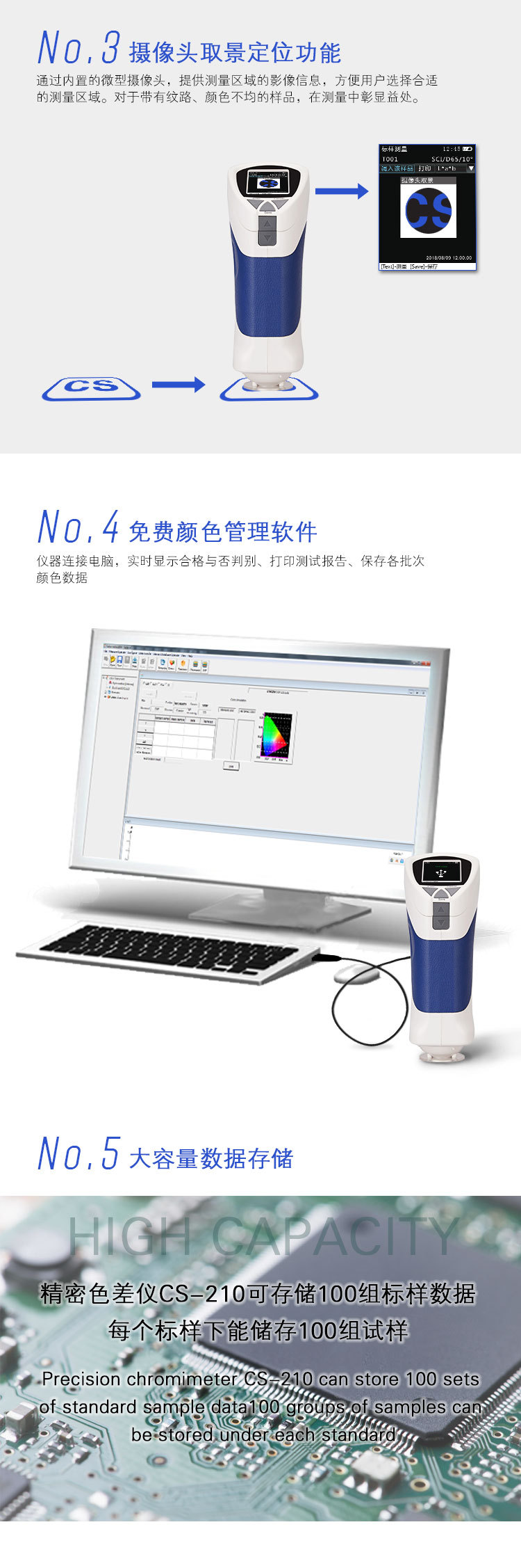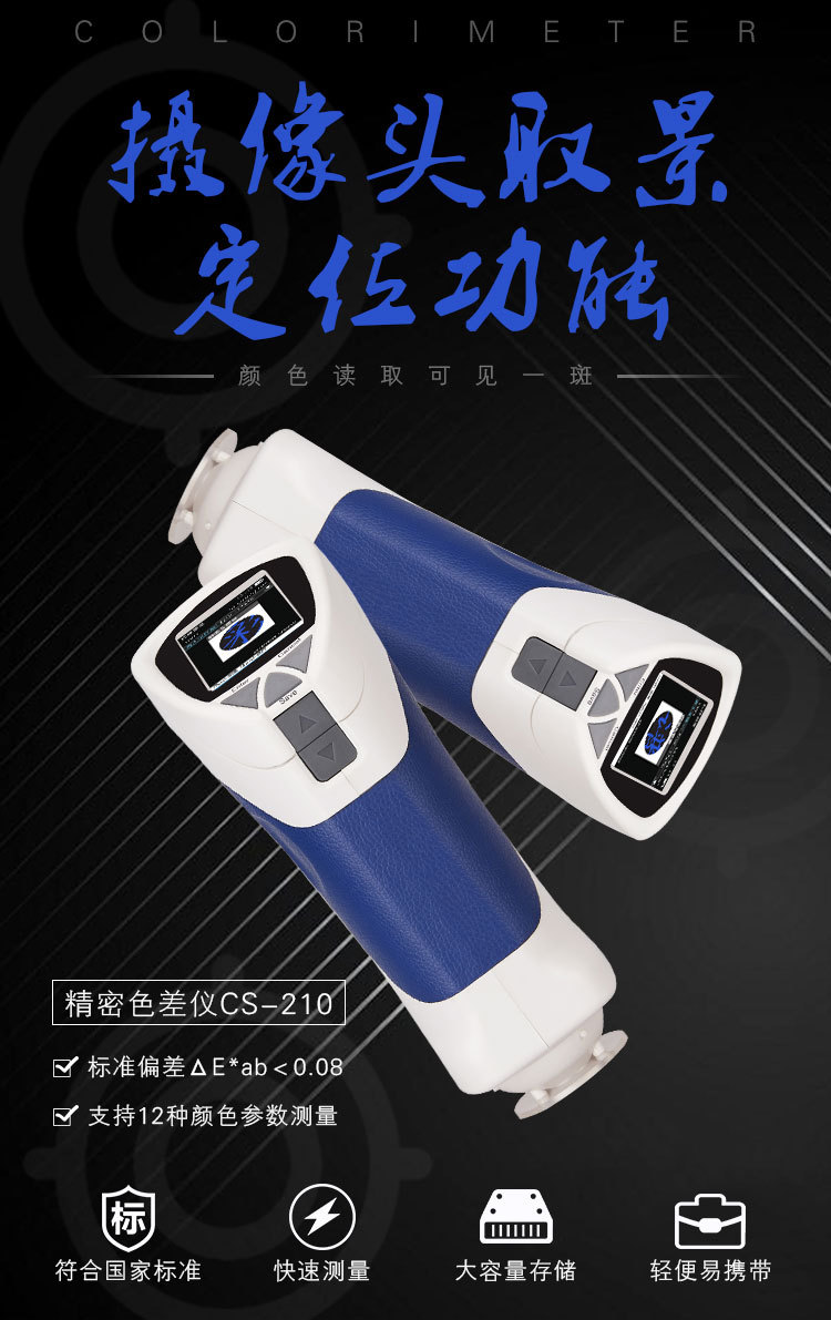 CS-210精密色差儀,廣泛應(yīng)用于塑膠、印刷、油漆油墨、紡織、印染服裝等行業(yè)的顏色管理*域,根據(jù)CIE色空間測量樣品色值L*a*b、L*c*h,與被測樣品的色差△E以及 △Lab值。