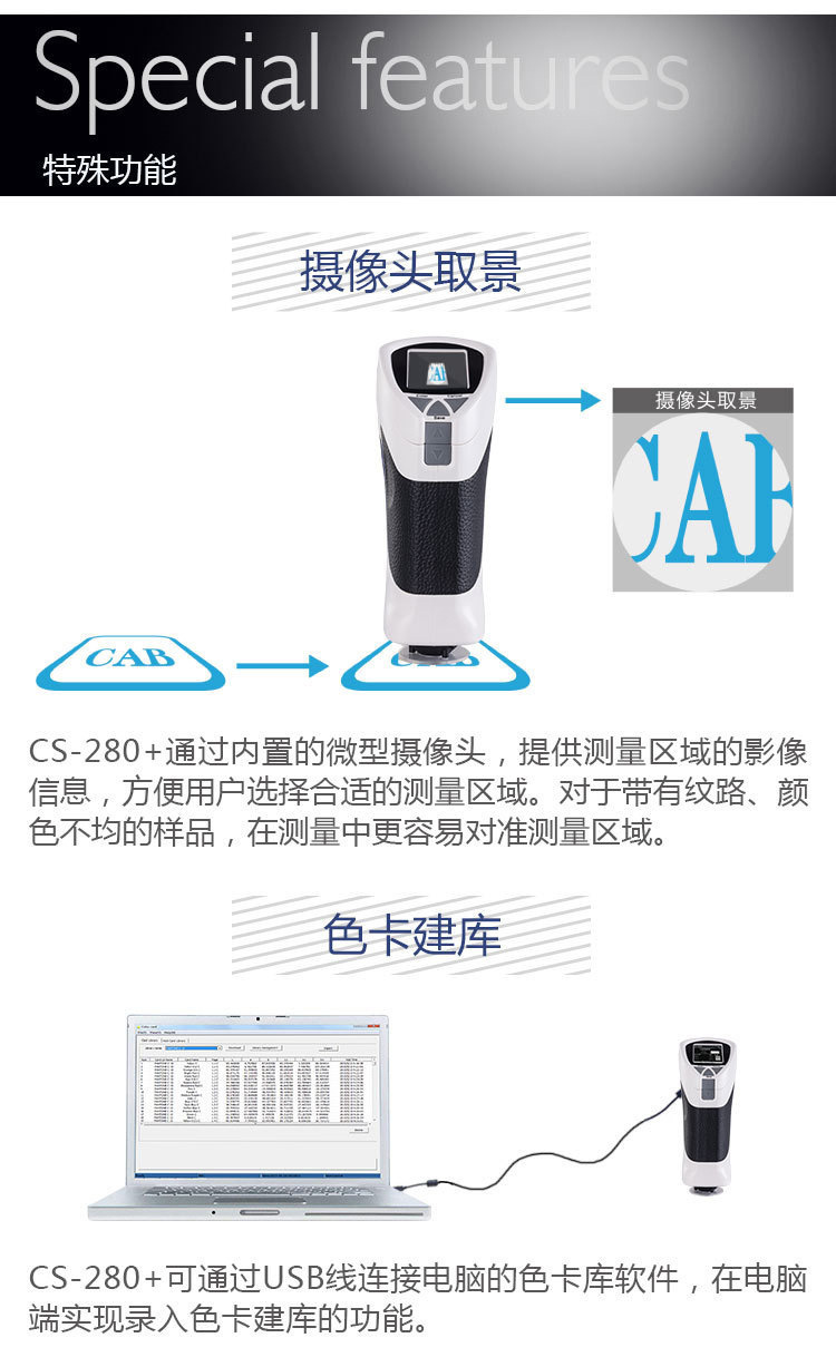 分光式色差儀CS-280采用分光式原理測量顏色色差,廣泛應用于塑膠、印刷、油漆油墨、紡織、印染服裝等行業的顏色管理*域,根據CIE色空間測量樣品色值L*a*b、L*c*h,與被測樣品的色差△E以及 △Lab值。