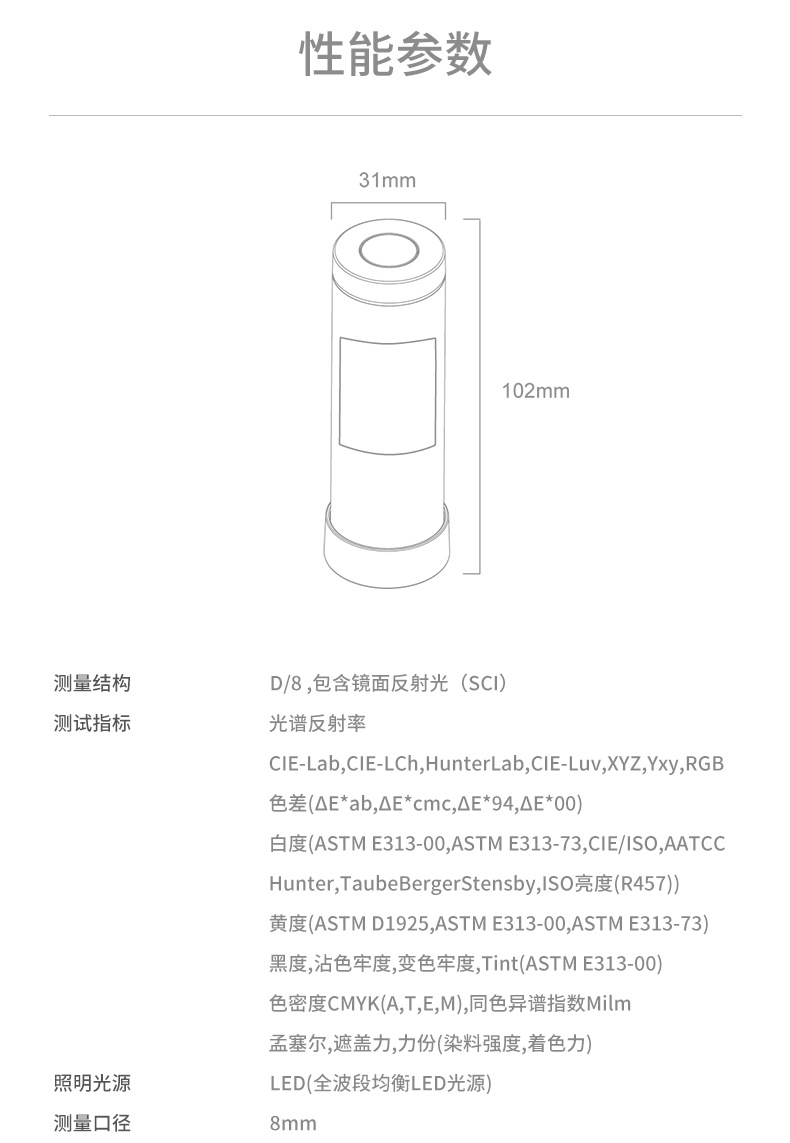 CIE/ISO,AATCC,Hunter,TaubeBergerStensby),黃度(ASTM D1925,