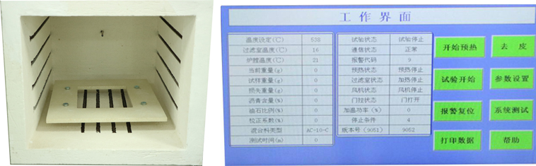 ⑹ 裝好混合料后,如果此時“過濾室溫度”顯示大于600度時,將料筐放在燃燒爐內(nèi)的托盤上,一定要將料筐放置在托盤的中央,才能確保試驗(yàn)結(jié)果的準(zhǔn)確性。